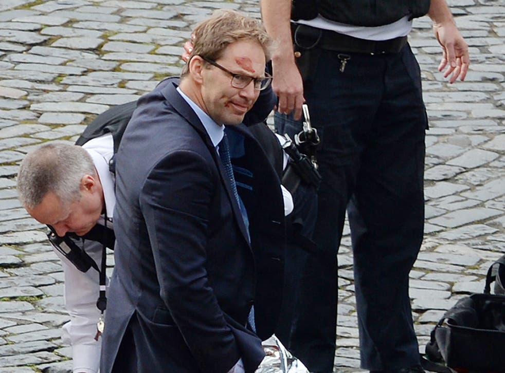 MP Tobias Ellwood face bloodied gave first aid to the fatally injured policeman but could not stop him from dying from his stab wounds outside the. Mr Ellwood a Foreign Office minister ran towards gunfire to help PC Keith Palmer who was stabbed in the attack while Mr Wallace helped co-ordinate the Governments response.